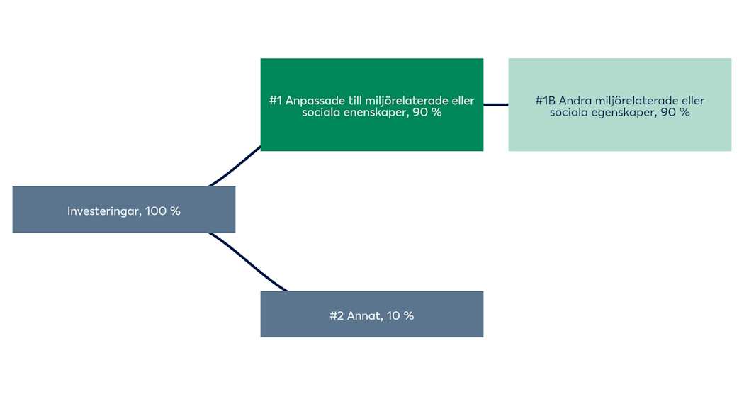 Fonden har minst 90 % investeringar som främjar miljörelaterade och sociala egenskaper. Fondens övriga investeringar inkluderar kontanter på fondens bankkonto på högst 10 %. Fonden förbinder sig inte att göra investeringar i ekonomiska verksamheter enligt EU:s klassificeringssystem. Fondens mål är inte att göra investeringar i fossilgas och/eller kärnenergi enligt EU:s klassificeringssystem.
