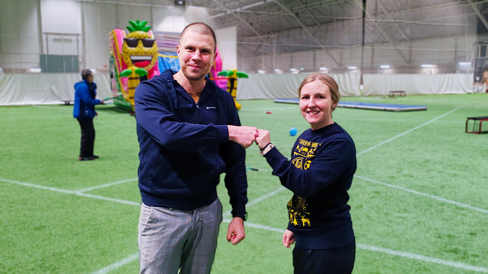 LähiTapiola Länsi-Suomen viestintä- ja vastuullisuuspäällikkö Toni Salminen ja tulevaa Ikinuorten Iirolandiaa organisoiva Pallo-Iirojen harrastekoordinaattori Henni Tukiainen talviharjoitteluhallilla Raumalla.